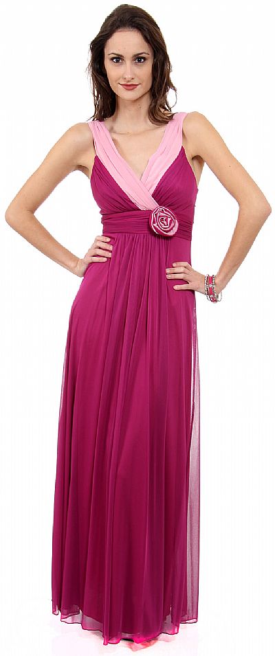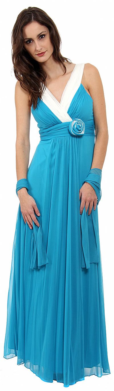 Two toned with V-neckline long formal dress with imperial waistline. Accentuating detachable fabric flower adorns waistline. Open back with two back wide straps and a back zipper closure. Matching scarf included. Made in the U.S.