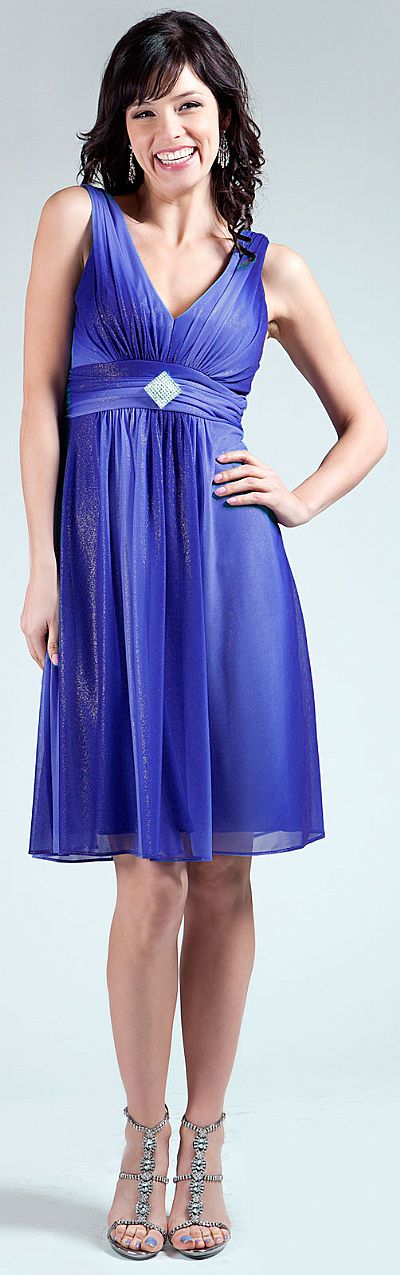 Two-toned colored shimmering broad strapped short party dress. Dress comes with a matching scarf and removable brooch.