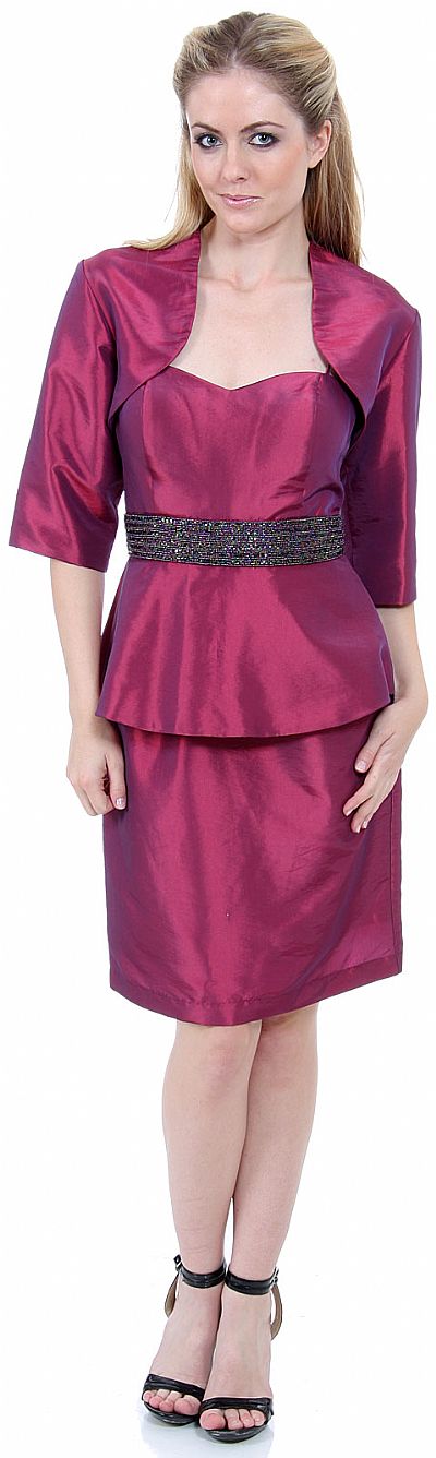 Heart-shaped spaghetti strap cocktail dress with a sequin beaded front waist line. Two piece look-alike dress with a short jacket included. Made of 52% Polyester and 48% Nylon. Back zipper closure.