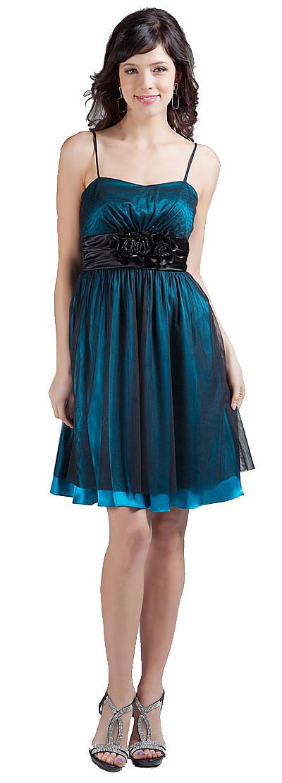 Formal spaghetti strap short dress. With a dual color combination and a bow along the empire waistline. Chiffon layered skirt right above the knee. Back zipper closure.