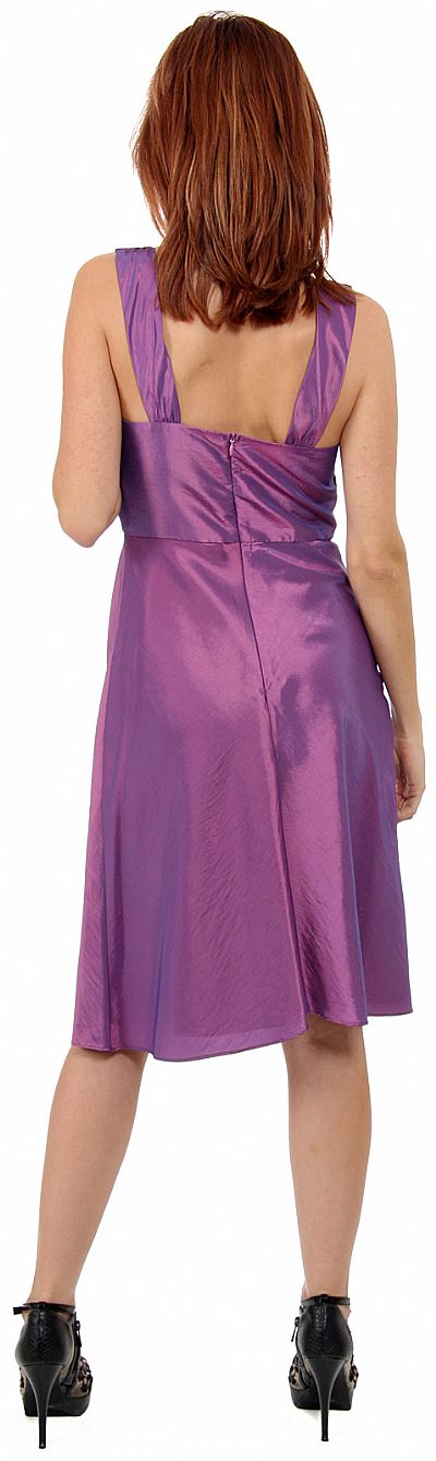 Formal Knee length dress with accentuating embellishments around neckline. Dress has a ruched detail along the bust area. Open back with two wide straps and a back zipper closure. Small jacket included.