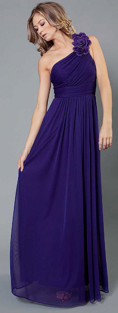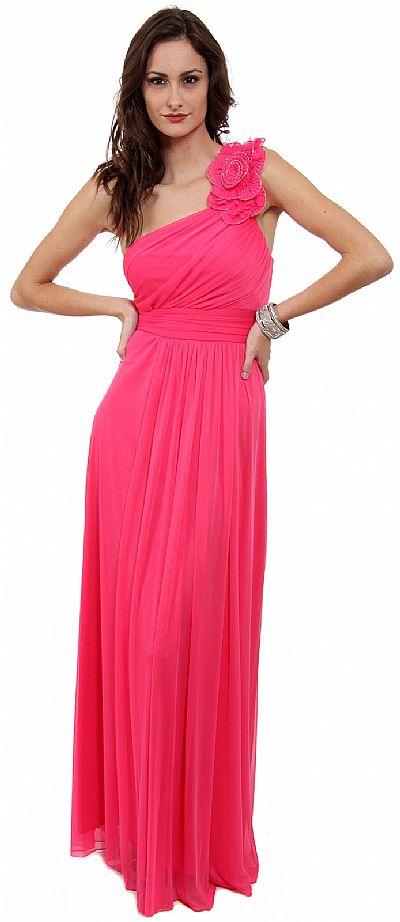 Full length formal dress has an imperial waistline with ruched detail along skirt and bust. One shoulder strap with accentuating fabric flower. Back zipper closure. Bare back. Made in the U.S.