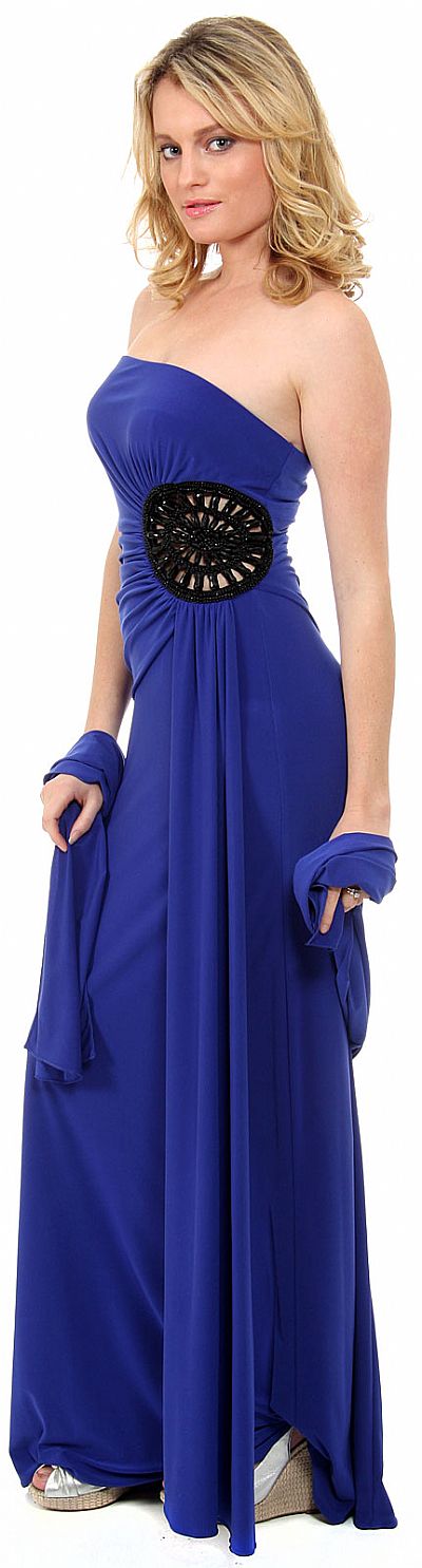 Strapless long cocktail dress has a cutout design at waist along the side. Ruched detail along waist and bust. Matching scarf included. Back zipper closure. Made in USA.