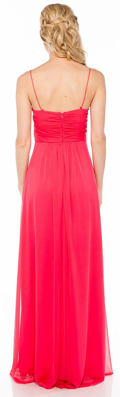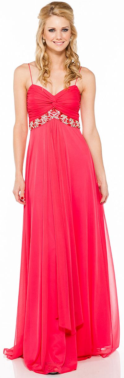 Empire waist formal dress with spaghetti straps and sequin accent. Bust is knotted & ruched. Hanging sash. Made of polyester chiffon. Made in USA.