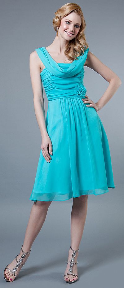 Short dress has a ruching detail along waistline, flared skirt, floral applique, drapped neckline, and a back zipper closure. Made of poly chiffon. Made in USA.