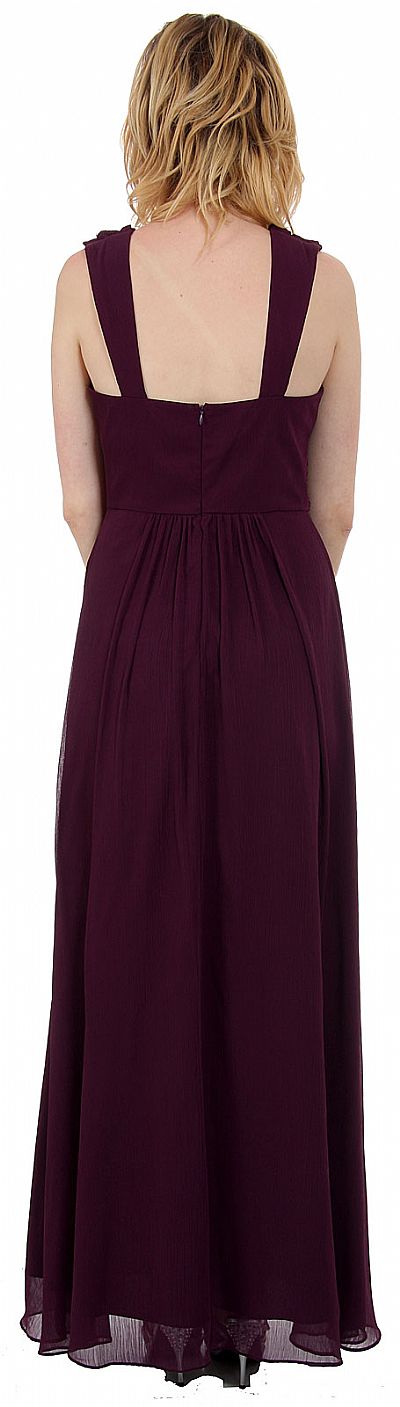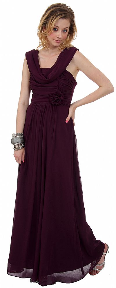 Long formal dress has a ruching detail along waistline, a draped neckline, wide straps along the back and a back zipper closure. Made of 100% polyester chiffon. Made in USA.