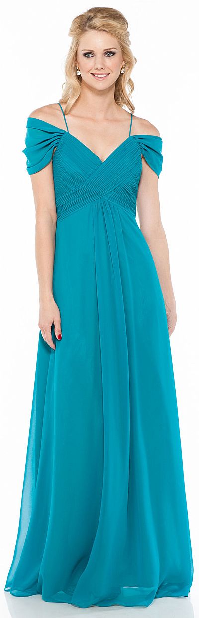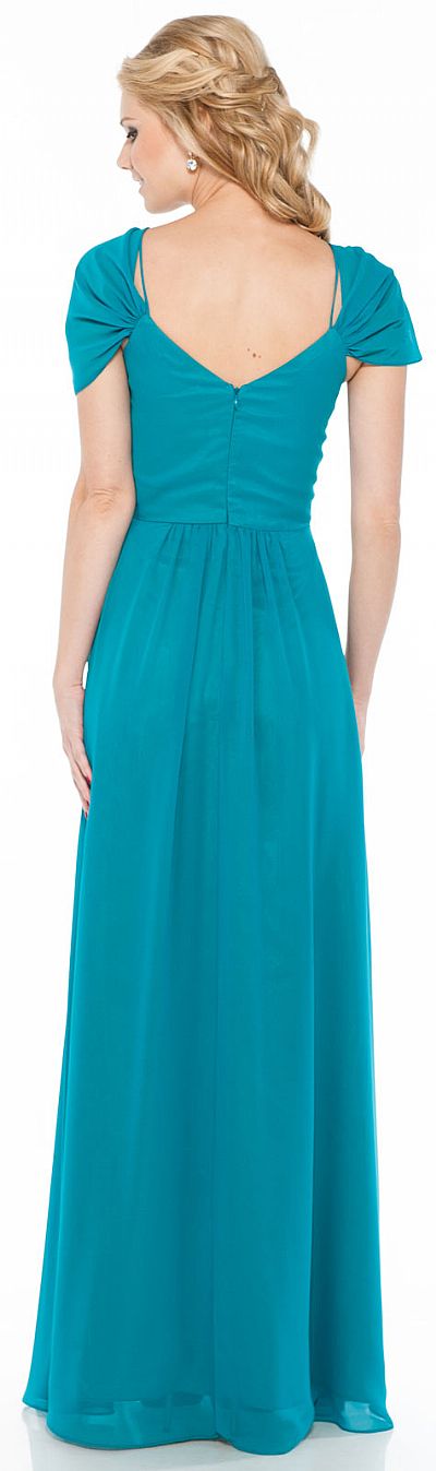 Full length formal dress with cap sleeves and criss-cross shirring at bust. Sleeves can be worn on or off the shoulder.