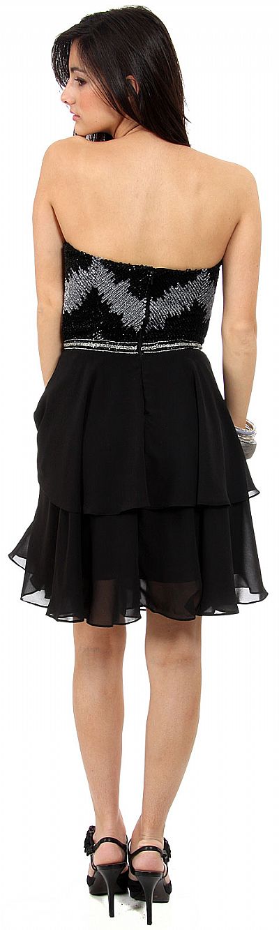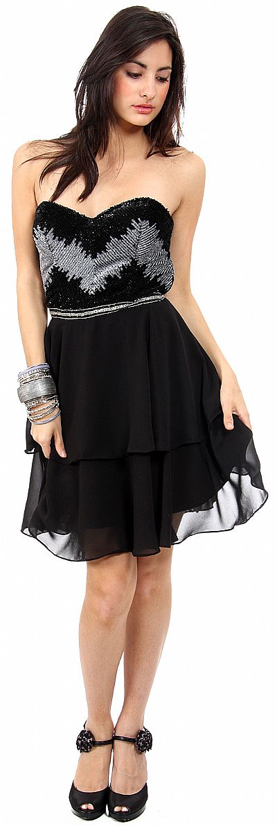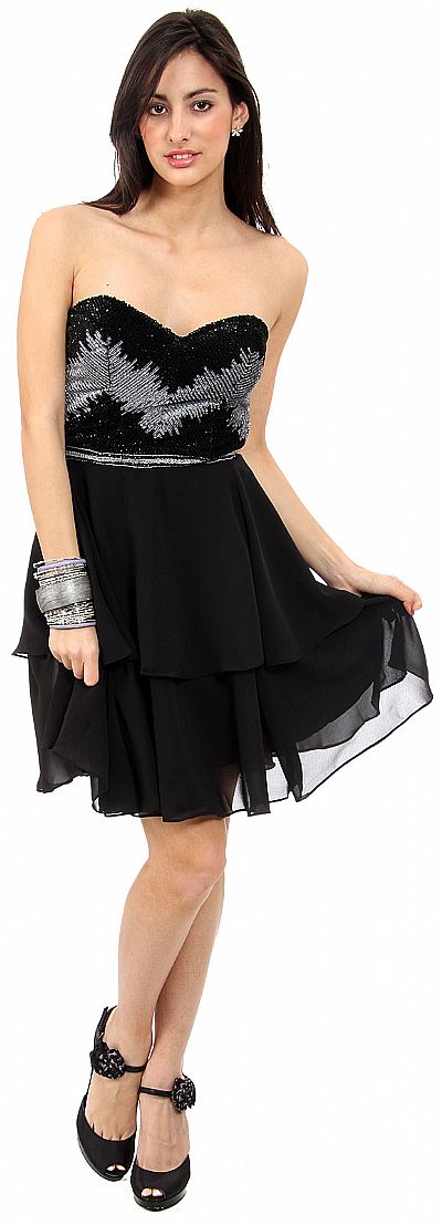 Strapless Sequined Bust Short Prom Dress with Silk Chiffon Skirt. Sweetheart neckline with two tone metallic sequins making a design at the bust. Cascading ruffles at the skirt with back zipper closure. Imported.