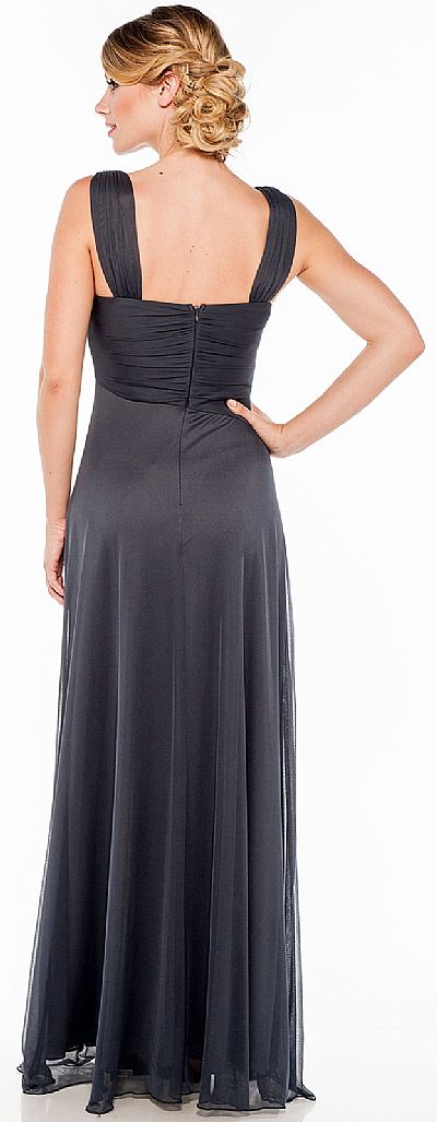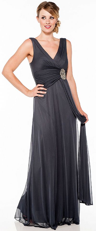 This is an elegant ruched full length formal dress with v-neckline, broad straps, sash and brooch accent. Back zipper closure. Made in USA.