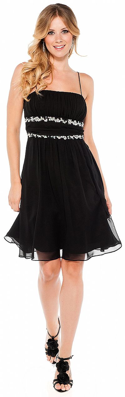 Spaghetti short cocktail dress with sequin accent. Empire waist with vertical shirring at bust. Horizontal shirring at waist, in between sequin accent.