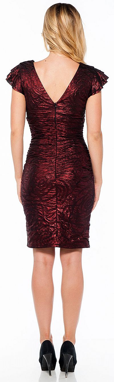 Form fitting knee length cocktail dress with cap sleeves. Wrap style top with shirred bodice. Patterned, metallic toned fabric. Made in USA.
