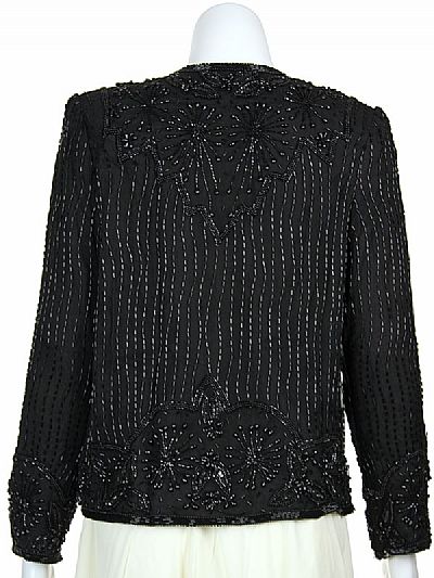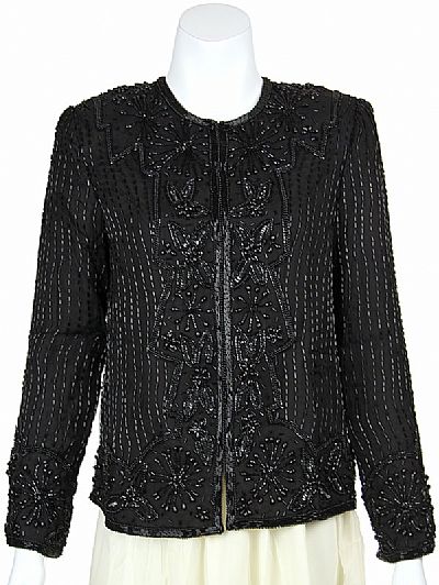 A hand beaded evening jacket with an elaborate sequin beaded border. Length measures 23 inches approx.