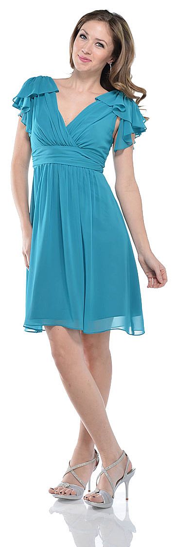 V-neck Shirred Formal Party dress with Ruffled Sleeves. Wrap style bodice which is ruched & ruched waistband also. Made of polyester chiffon. Made in USA.