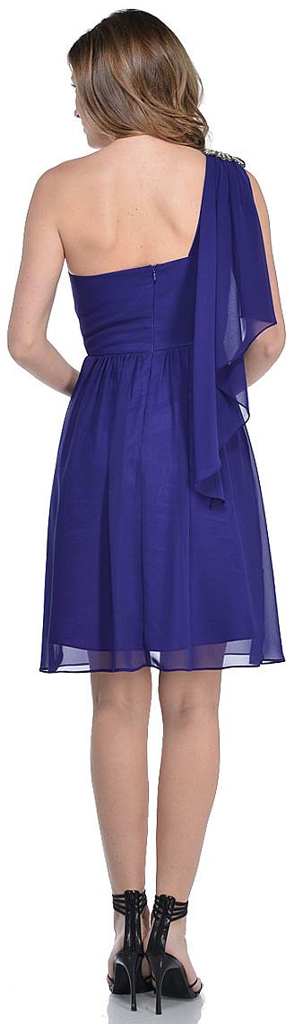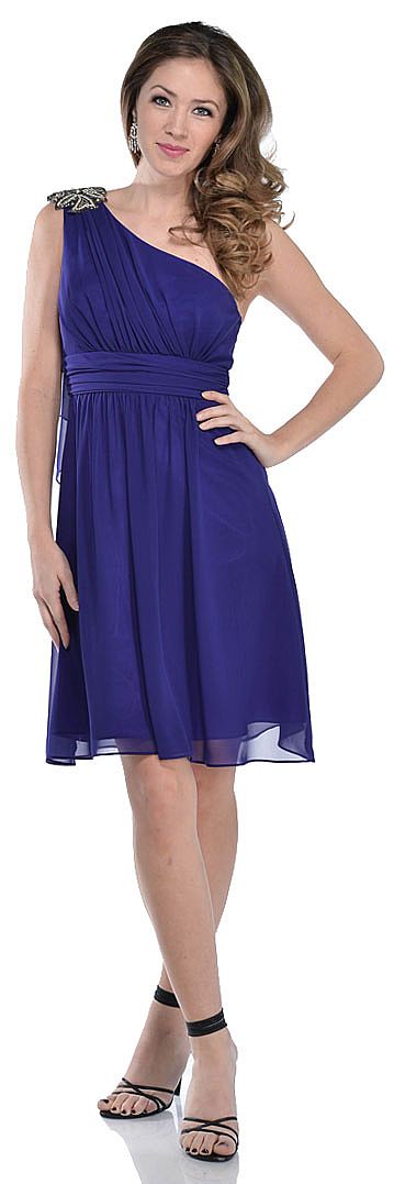One Shoulder Empire Short Party Dress with floral patch on the shoulder. Hanging sash at the back of the shoulder, ruched bodice and waistband. Back zipper closure & comes with matching scarf. Made in USA.