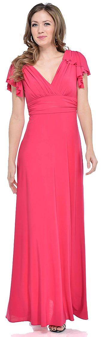 V-neck Empire Cut Shirred Formal Party dress with Ruffled Sleeves. Wrap style bodice which is ruched & ruched waistband also. V-cut back with zipper closure. Made of polyester chiffon. Made in USA.