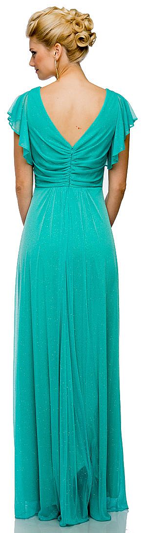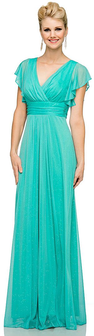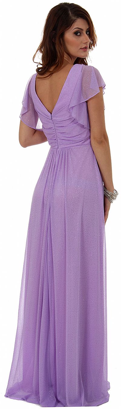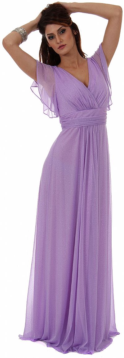 V-Neck Empire Cut Glitter Long Formal Dress with Flutter Sleeves. Crossover top is little shirred with shirred waistband. V-back is also little shirred with zipper closure. Gathered design at the center of the skirt also. Made in USA.