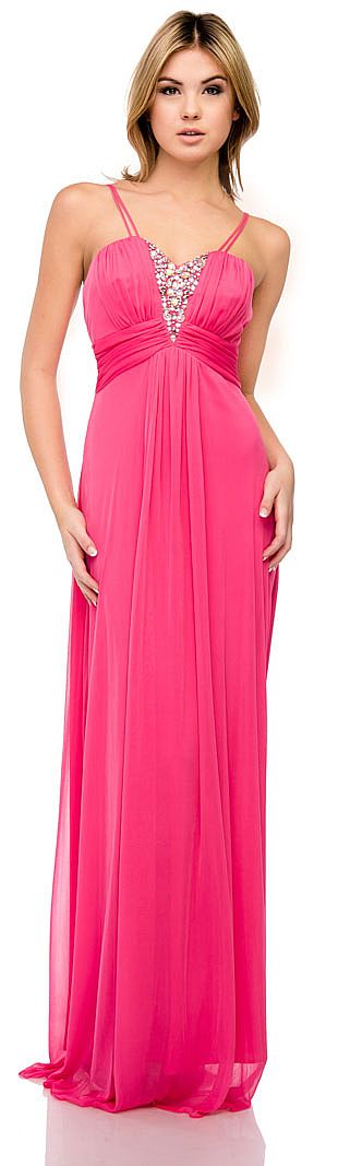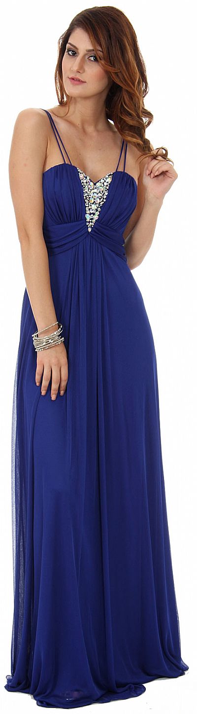 Double Spaghetti Straps Long Formal Dress with Jewels. Sweetheart neck empire cut dress has iridescent jewels in a v-shape in the center of the bust. Shirred bust & waist with little shirring at back also. Back zipper closure. Made in USA.