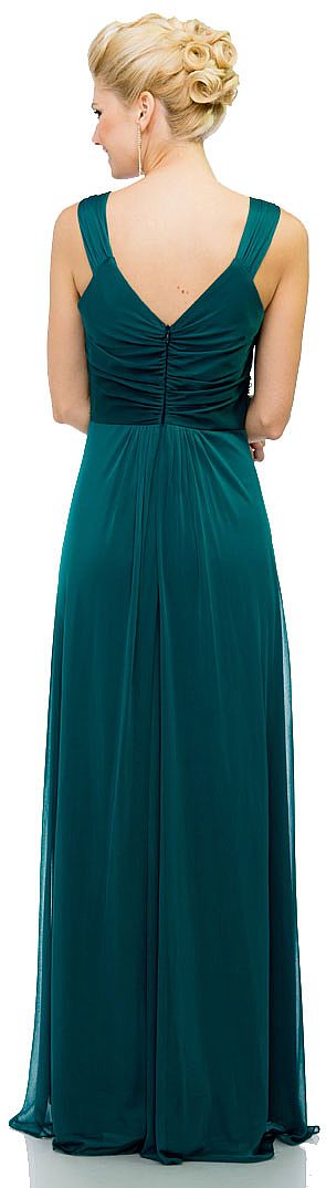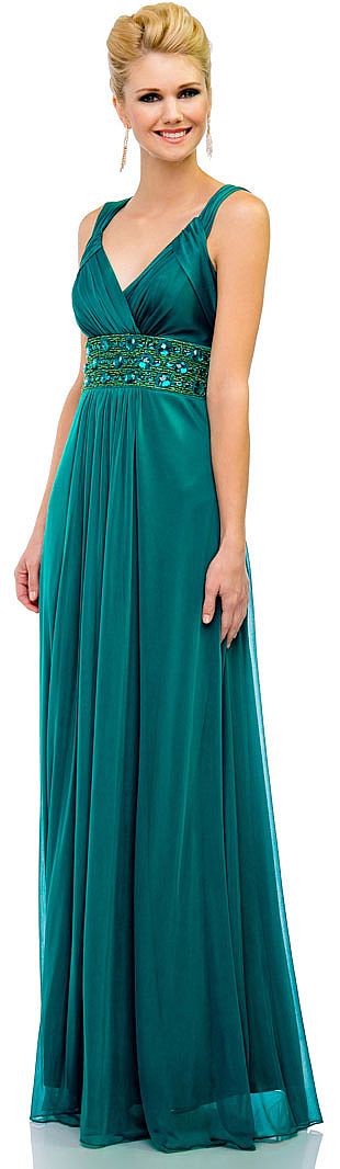 V-Neck Broad Straps Long Formal Dress with Chunky Beads at Waist. Overlap bust is little gathered and also the broad straps. Beaded waist with small as well as chunky beads. Skirt also little gathered below the waist. V-shape back with zipper closure. Matching scarf included. Made in USA.