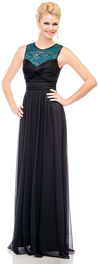 Round Neck Long Formal Dress with See-Thru Lace at Neck & Back. Ruched bust has a twisted knot with ruching below that also. Floral pattern see-thru lace at neckline & all of the back. Back zipper closure. Made in USA.