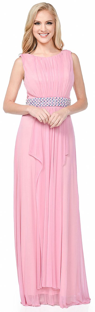 Gathered Bust Beaded Waist Long Formal Bridesmaid Dress. Round neck sleeveless dress has gathered bust & little gathered asymmetrical hanging sash at the skirt. Beaded waistband in front with cowl back & little ruching at back with zipper closure also. Made in USA.