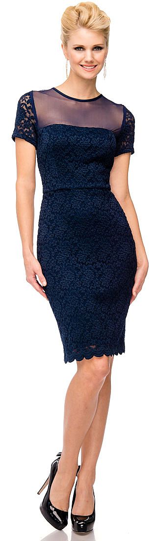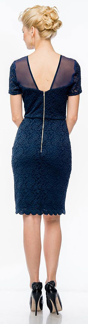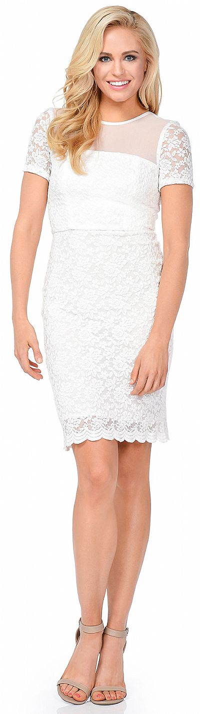 Short Sleeves Form Fitting Short Formal Party Dress in Lace. Round neckline has sheer fabric all around it. Floral pattern lace forms the body of the dress with scallops like hem. V-shape sheer back with silver zipper closure. Made in USA.