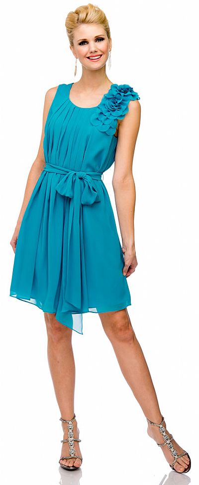 | PLEATED SHORT PARTY DRESS WITH FLORAL SHOULDER & WAIST SASH (item #11423)