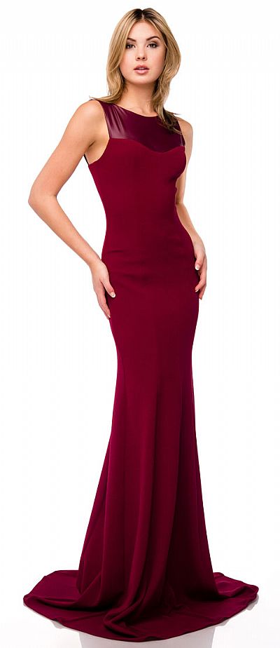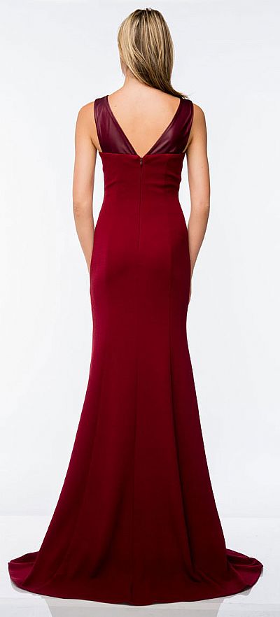 Sleeveless Fitted Floor Length Formal Prom Dress with Faux Leather Panel. Matching leather panel around neckline at front & back gives sophisticated look. Flared bottom is floor length with v-shape back & zipper closure. Made in USA.