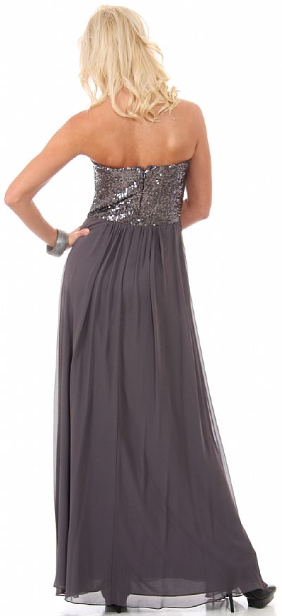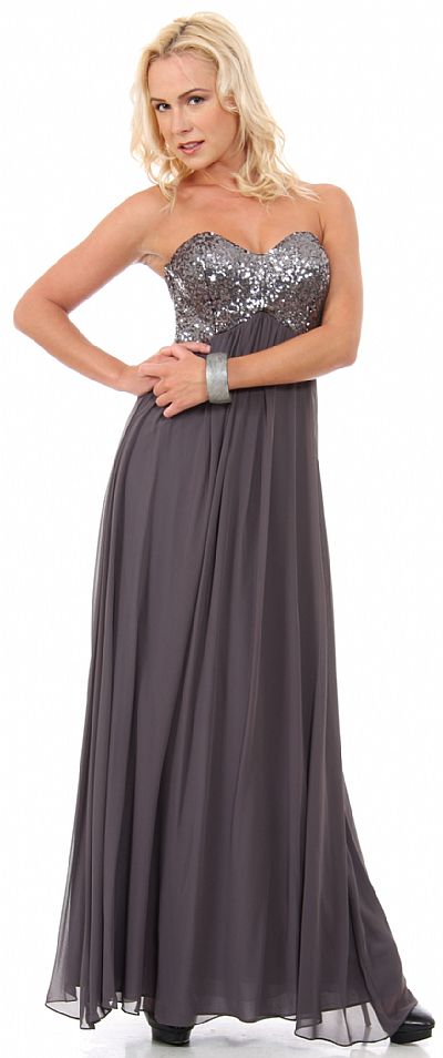 Strapless Sequins Bust Long Formal Evening Dress. Sweetheart neck on this empire cut bridesmaid or any formal occasion dress. Empire cut on bust gives a flowing look to the skirt. Back zipper closure with matching scarf included. Made in USA.