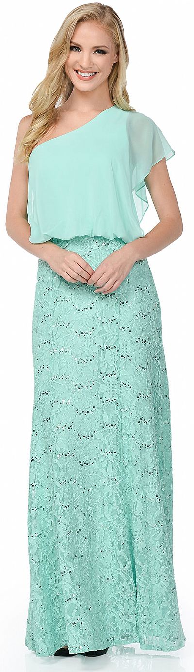 One Shoulder Top Sequins Lace Skirt Formal Bridesmaid Dress. Asymmetrical blouson style chiffon top with single shoulder & loose sleeve. Patterned lace skirt is flared & has sequins all over it. Side zipper closure. Comes with scarf. Made in USA.