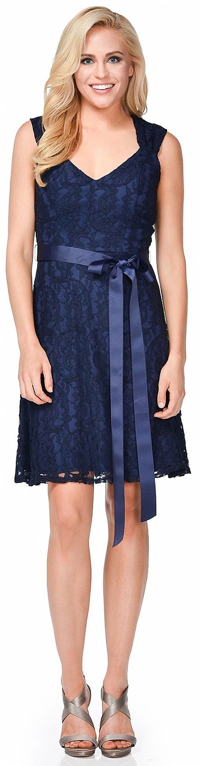 V-Neck Lace Short Formal Party Dress with Belt. Sleeveless dress has patterned lace overlay with broad shoulder straps. Removable satin belt at the waist. Triangle shape cutout at back with button closure. Back zipper closure. Made in USA.