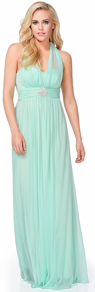 Halter Neck Empire Waist Long Formal Bridesmaid Dress. Sheer halter neck ties at the back of the neck with bust having sweetheart neckline. Diamond brooch accent on the shirred waist. Back zipper closure. Made in USA.