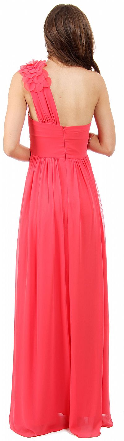 One Shoulder Long Formal Prom Dress with Floral Applique. Single shoulder is gathered along the bust and adorned with layered floral applique. Ruched waistband on this empire cut formal dress which can be worn as bridesmaid dress, prom dress or on any formal event. Back zipper closure. 100% polyester. Made in USA.
