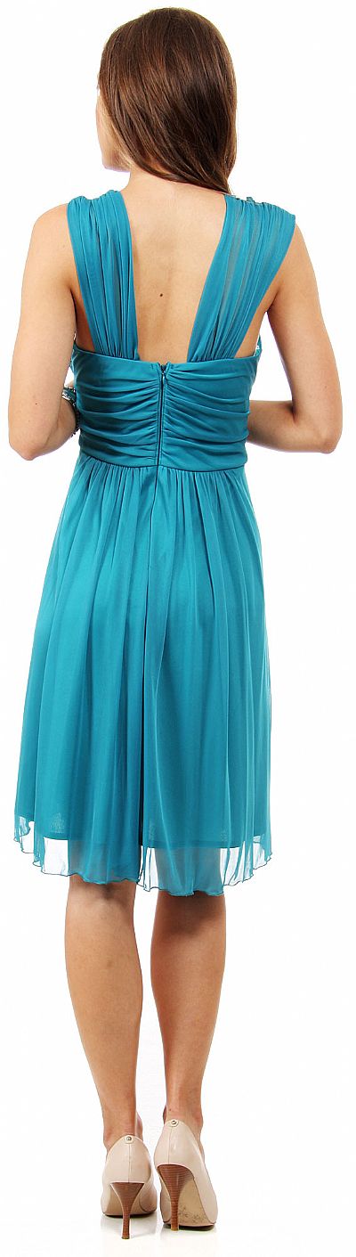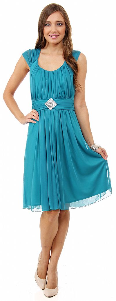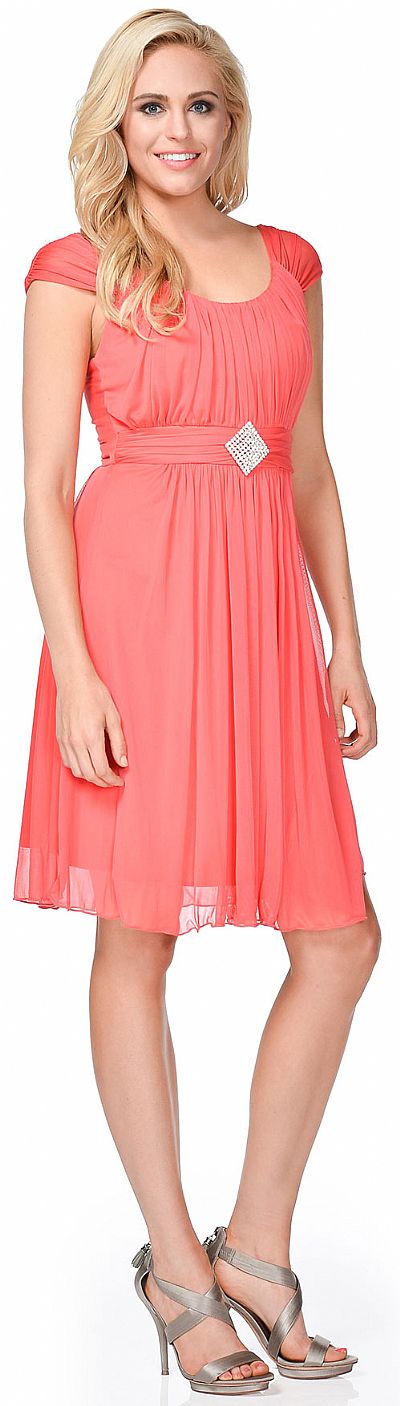 Scoop Neck Broad Straps Shirred Short Bridesmaid Party Dress. Shirred bust & waist with gathered broad straps in the front & back also. Diamond shape rhinestones broach at the waist with little gathered skirt below waist. Back zipper closure. Made in USA.