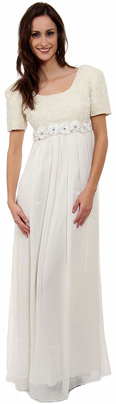 Full length dress with a short sleeved hand beaded top. Fabric floral designs are embellished around waistline. Back zipper closure. 100% silk with polyester lining. Imported.
