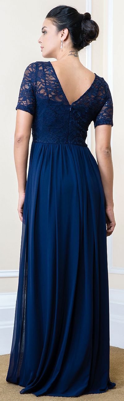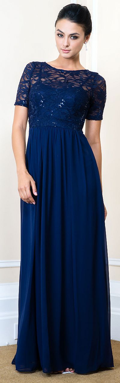| SEQUINS LACE BODICE HALF SLEEVES LONG FORMAL EVENING DRESS. (item #11487)