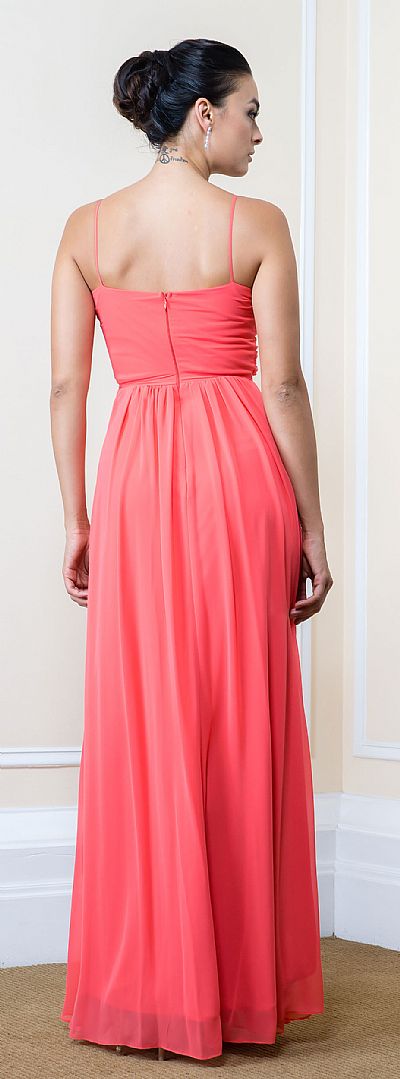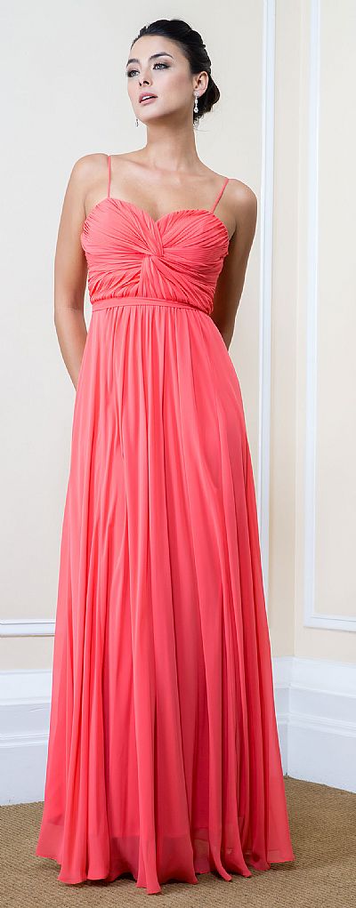 Pleated Bust Spaghetti Straps Long Formal Bridesmaid Dress. Empire cut pleated bodice has a twisted knot design with thin belt below the bust. Sweetheart neckline with gathered & flowing skirt. Back zipper closure on this polyester chiffon dress. Made in USA. Imported.