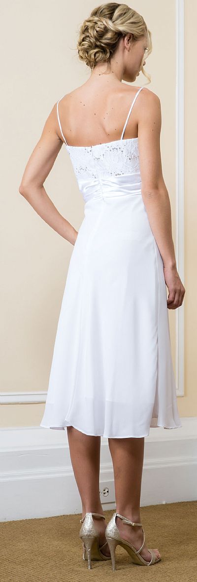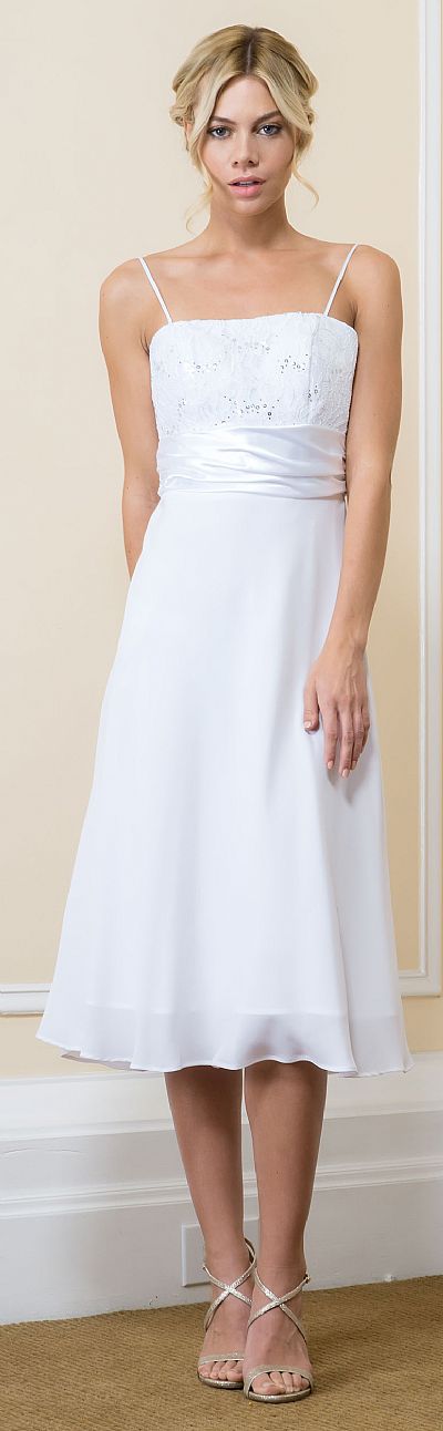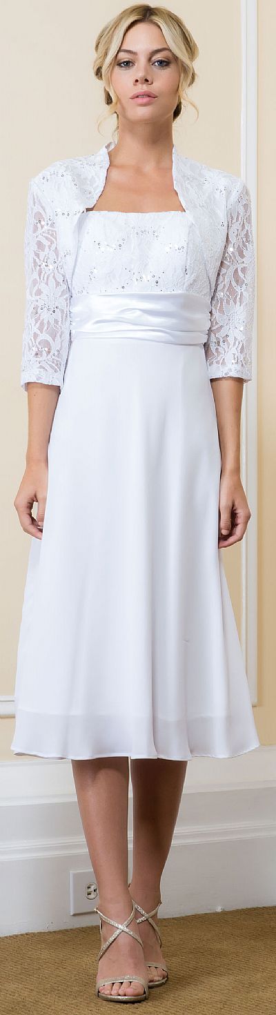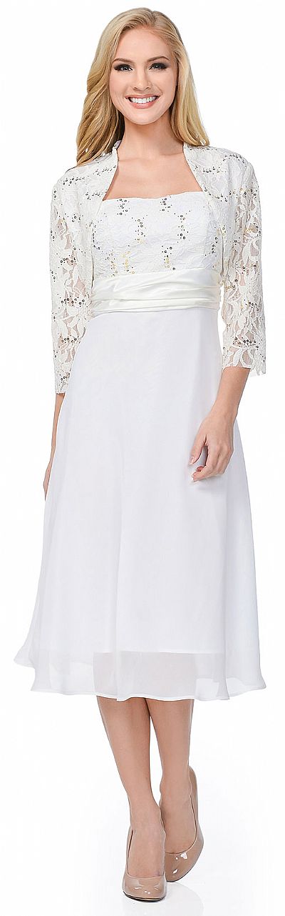 Knee Length Lace Top Chiffon Skirt Formal MOB Dress with Bolero. Lace bust & three-fourth sleeves bolero has little sequins on it. Satin waistband with knee length polyester chiffon skirt. Back zipper closure. Made in USA.
