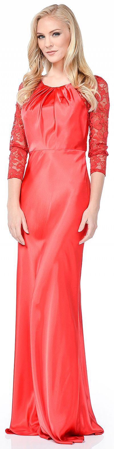 Gathered Neck Satin & Lace Formal Bridesmaid Dress. Full length maxi dress in satin with three-fourth length lace sleeves with lace cutout back also. Little ruching at the back with zipper closure & button closure also. Made in USA.