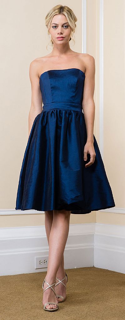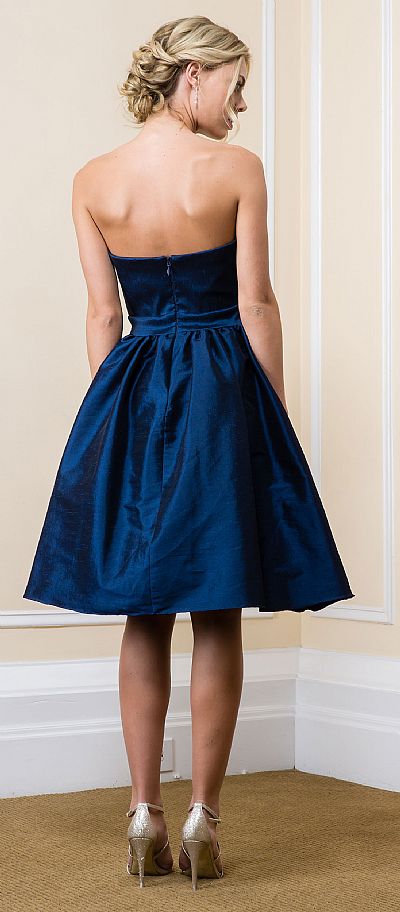Strapless Solid Color Knee Length Bridesmaid Party Dress. Straight neckline with same fabric belt accent on this polyester taffeta dress. Taffeta fabric gives skirt the puffy look. Back zipper closure. Made in USA.