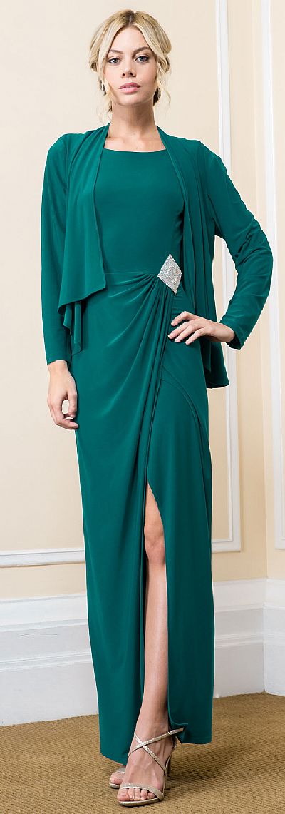 Boat Neck Full Sleeves Jacket Formal Mother of the Bride Dress. Sleeveless overlap style front side slit dress with rhinestones brooch on the waist. Full sleeves high-low jacket comes with the dress. Little ruched at waist with deep v-neck at the back with zipper closure. Made in USA.