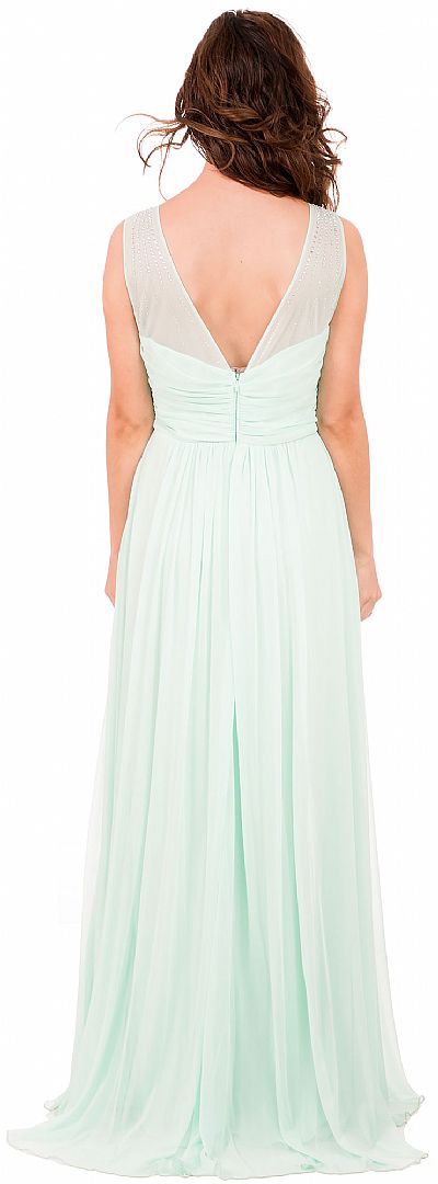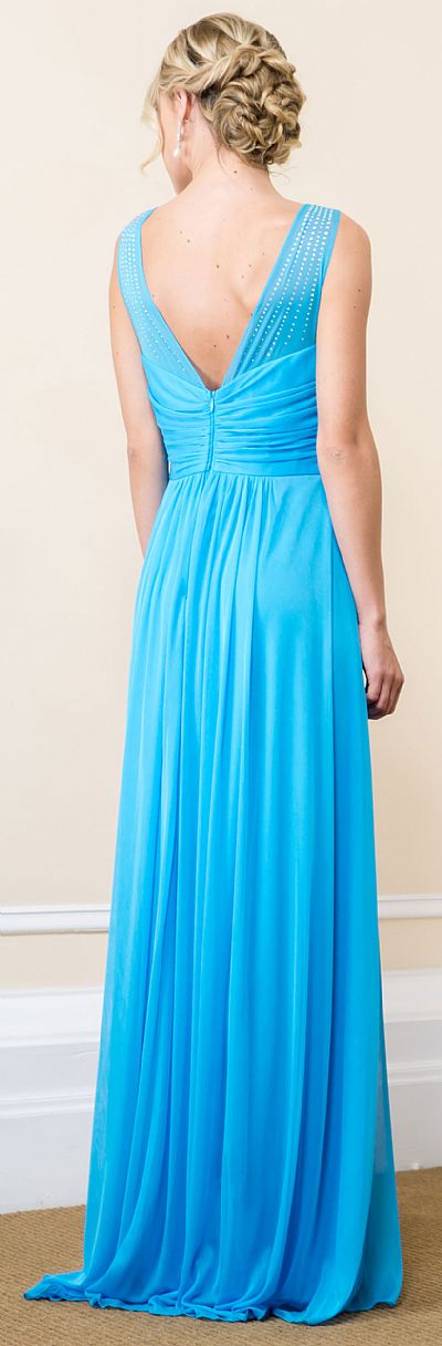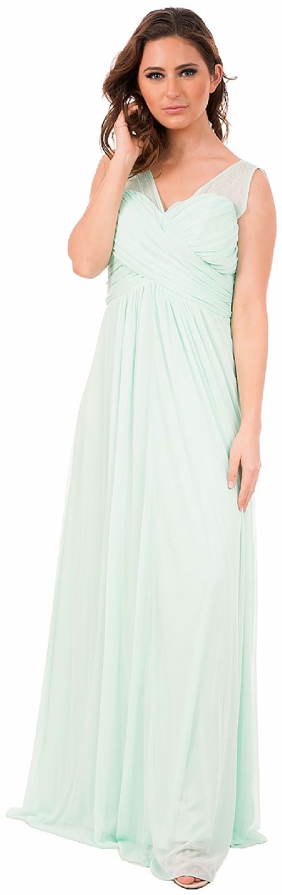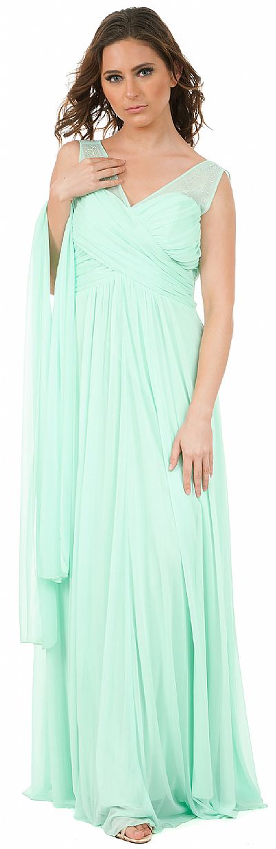 V-Neck Rhinestones Shoulder Ruched Bust Formal Bridesmaid Dress. Sleeveless dress has sheer shoulders with rhinestones making rays like design on them. Overlap style ruched bust is empire cut. V-shape back with zipper closure. Matching scarf included. Made in USA.