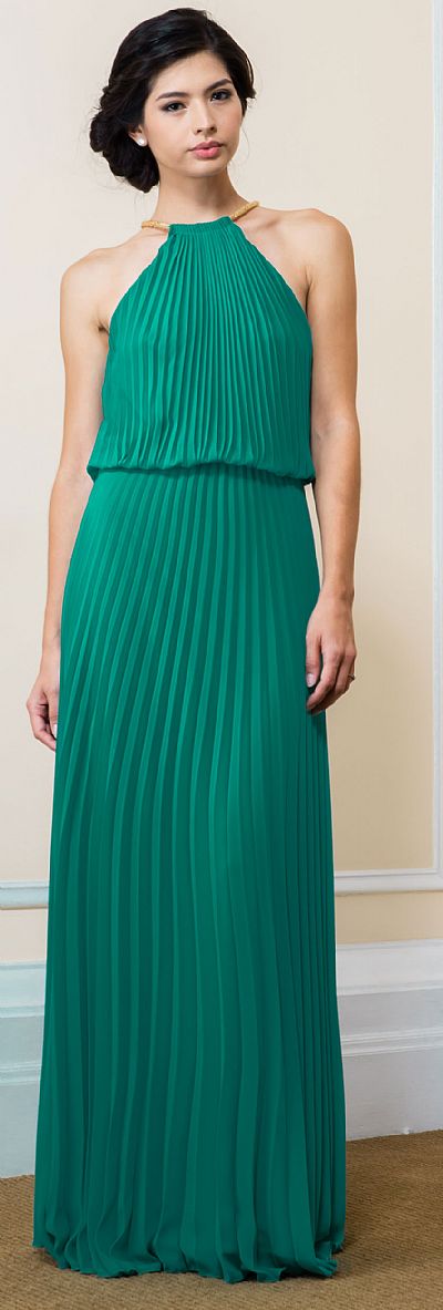 Pleated Halter Neck Blouson Top Long Formal Dress. Necklace like gold metal choker adds little zing to this formal bridesmaid dress. Pleating all over the dress gives statement to this dress with loose fitted blouse like top. Comes with scarf. Made in USA.