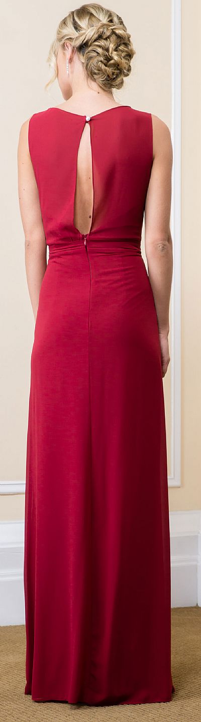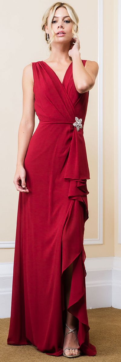 V-Neck Wrap Style Front Slit Long Formal Evening Dress. Sleeveless wrap style dress has front slit with ruffled hem & decorated with star broach on the waist. Keyhole back with button closure and zipper closure too. Comes with scarf. Made in USA.