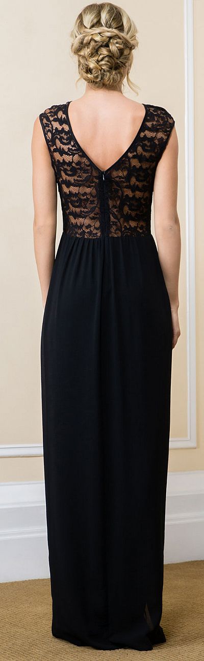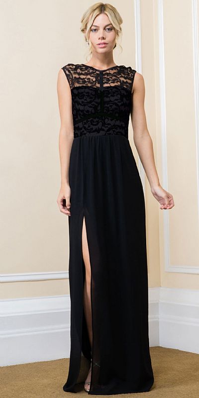 Lace Top Boat Neck Long Evening Gown with Front Slit. Patterned sheer lace around neckline & back. Skirt has slit on the side to give little oomph factor. V-shape back with zipper closure. Made in USA.