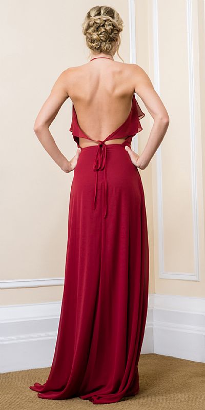 Halter Neck Flutter Top/Sleeve Long Formal Evening Dress. Deep v-neck with flutter top or can be worn as flutter sleeves over the shoulder. Tie-at-the-back-straps with back zipper closure too. Floor length dress has flared skirt & open back. Made in USA.