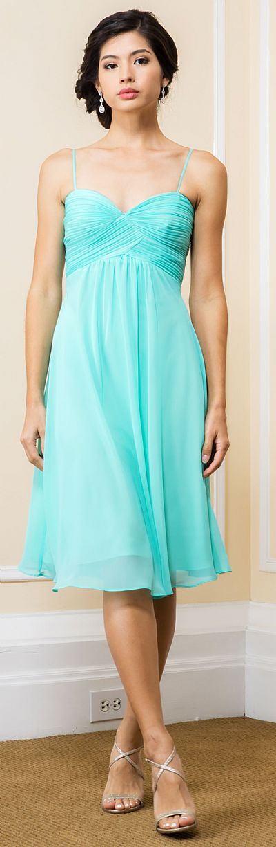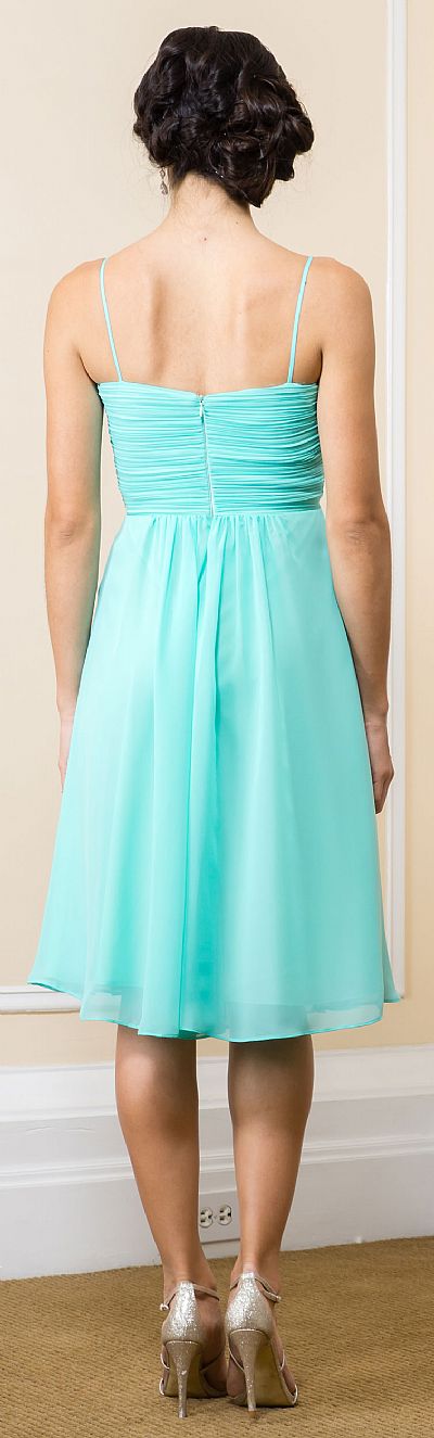 Sweetheart Neck Calf Length Bridesmaid Party Dress. Spaghetti straps dress has ruched pattern all around the empire cut bodice. A-shape skirt has below the knee length with back zipper closure.