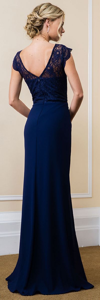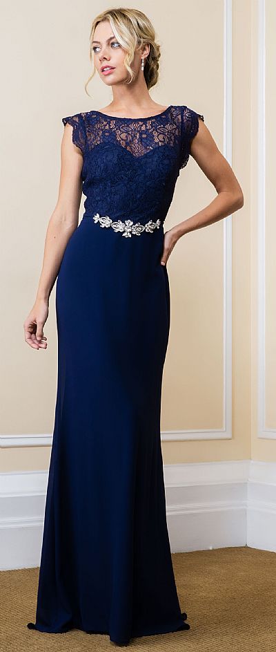 Lace Bodice Bejeweled Waist Long Formal Evening Dress. Floral pattern lace at the bodice in front & back with boat neckline. Sweetheart neck under the lace at bust. Cap sleeves with rhinestones belt at the waist. V-shape back with zipper closure. Comes with scarf. Made in USA.