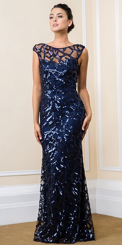 Boat Neck Sequins Pattern Mesh Long Formal Prom Dress. Mesh dress has squared sequins pattern all over with round neck & little cap sleeves. Little flared bottom with invisible zipper at the back. Comes with scarf. Made in USA.