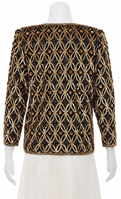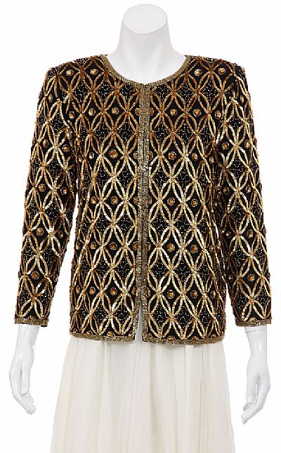 Full sleeves hand beaded sequin jacket with front hook closure. Sequined design of leaves in a symmetrical pattern spread over this jacket. Bejeweled border all around the jacket. Shoulder padded. Imported.