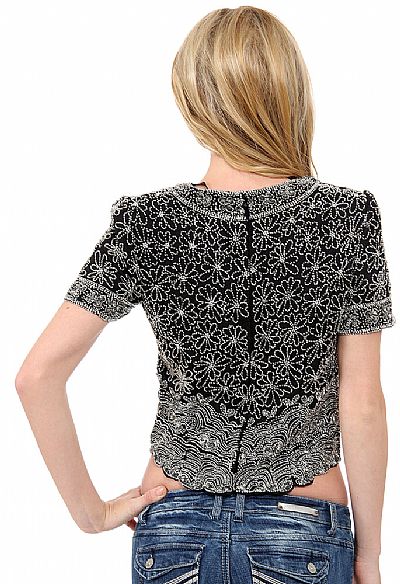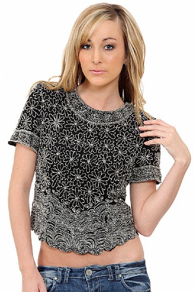 SHORT SLEEVED NET TOP WITH SILVER PETAL SEQUINS